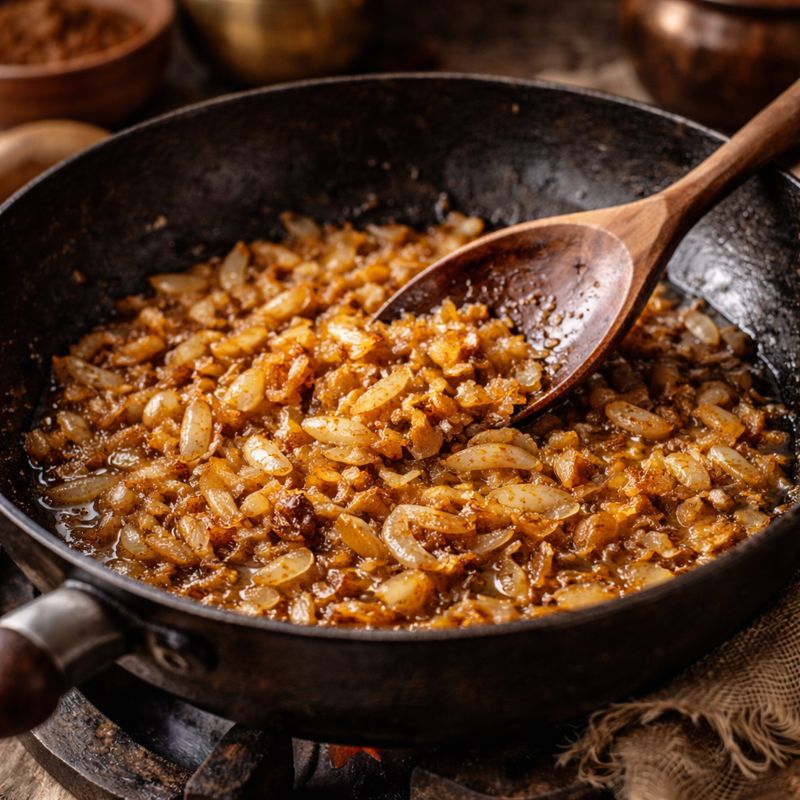 Heat oil in a pan, add onions, and sauté until golden brown. Add ginger-garlic paste and green chillies, cooking until aromatic.