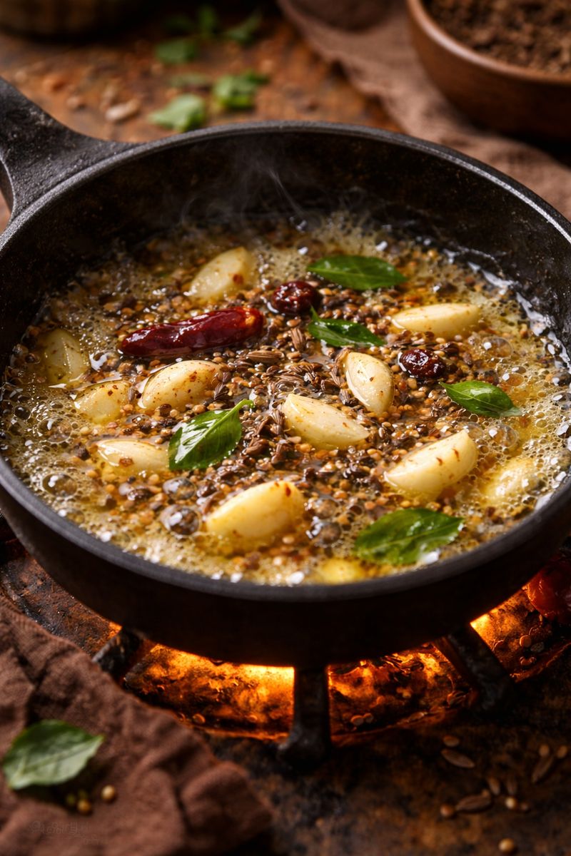 Heat ghee in a small pan, add cumin seeds, garlic, red chillies, and hing. Let it splutter until aromatic.