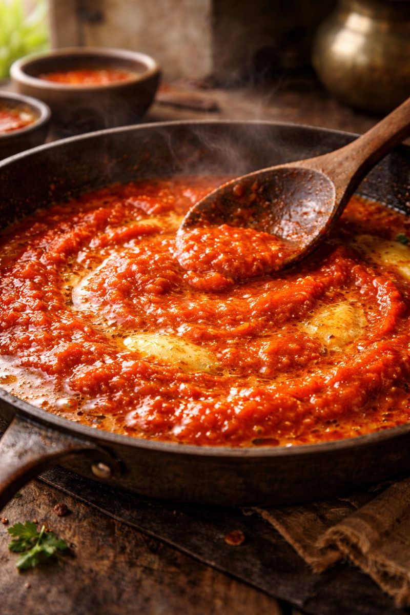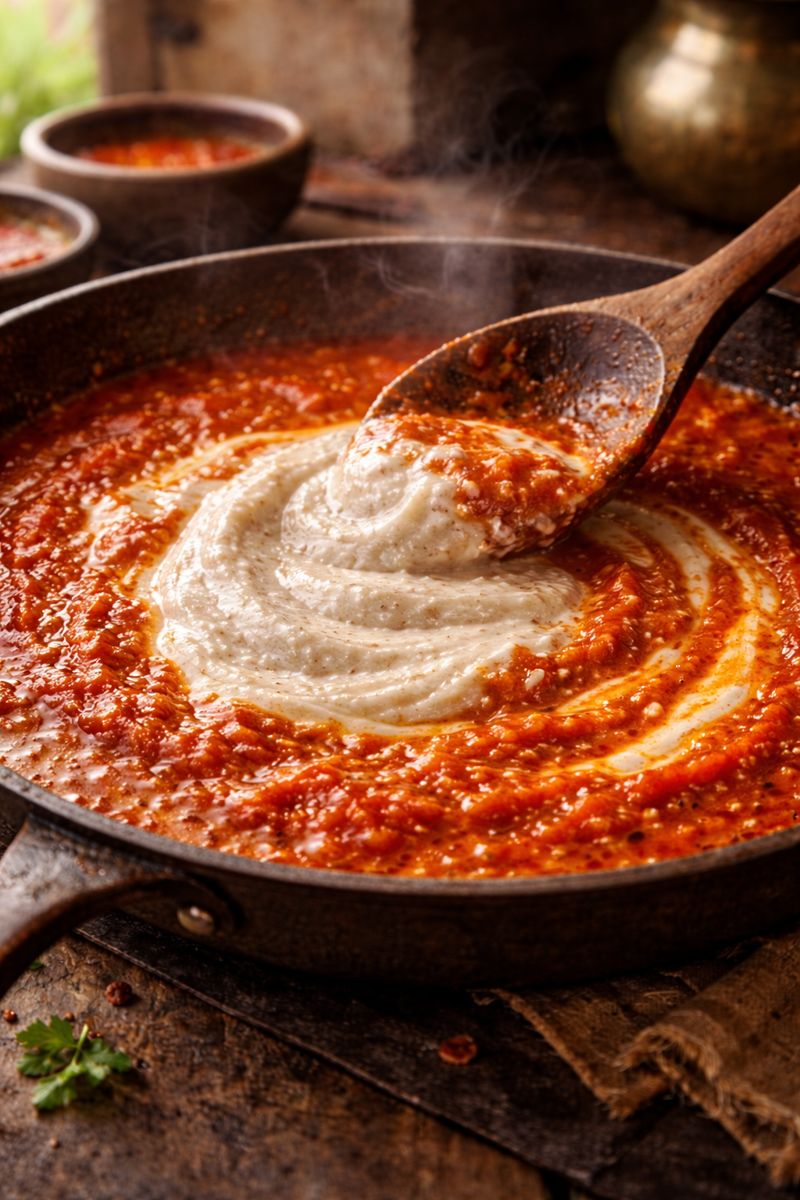 Add ground cashew paste, Kashmiri chilli powder, salt, and sugar. Cook on low heat for a smooth, rich gravy.