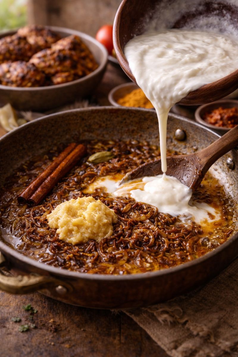 Add ginger-garlic paste and cook briefly. Lower heat and add whisked yogurt gradually, stirring continuously.