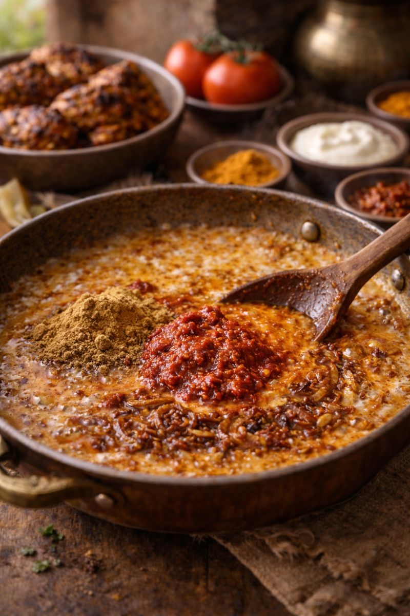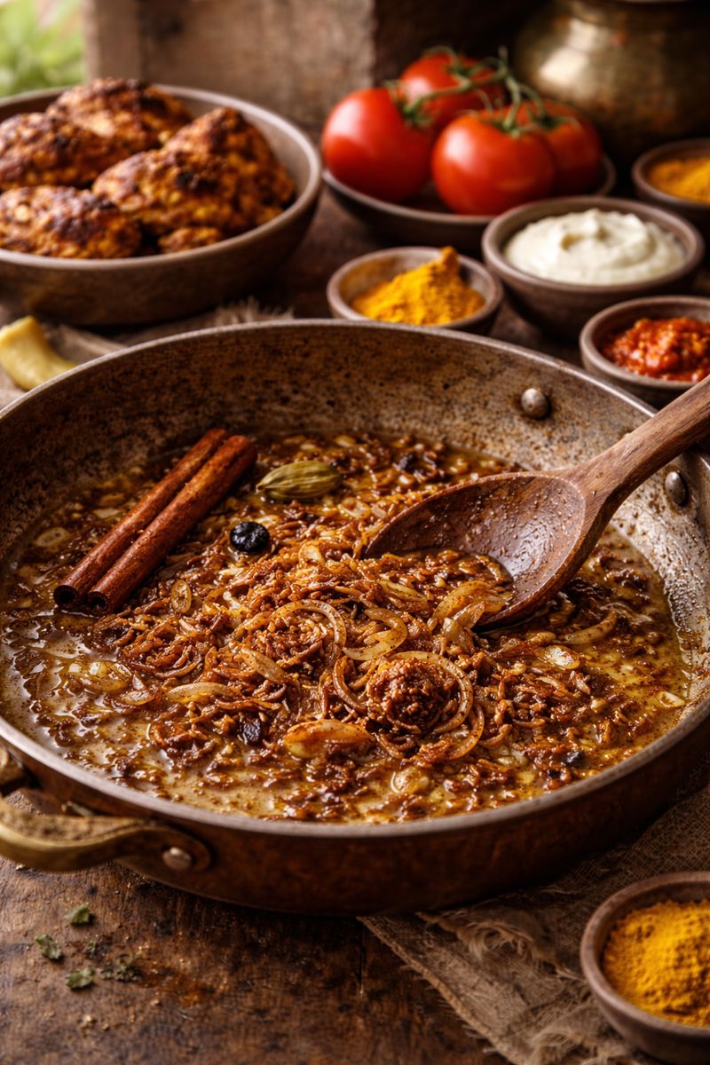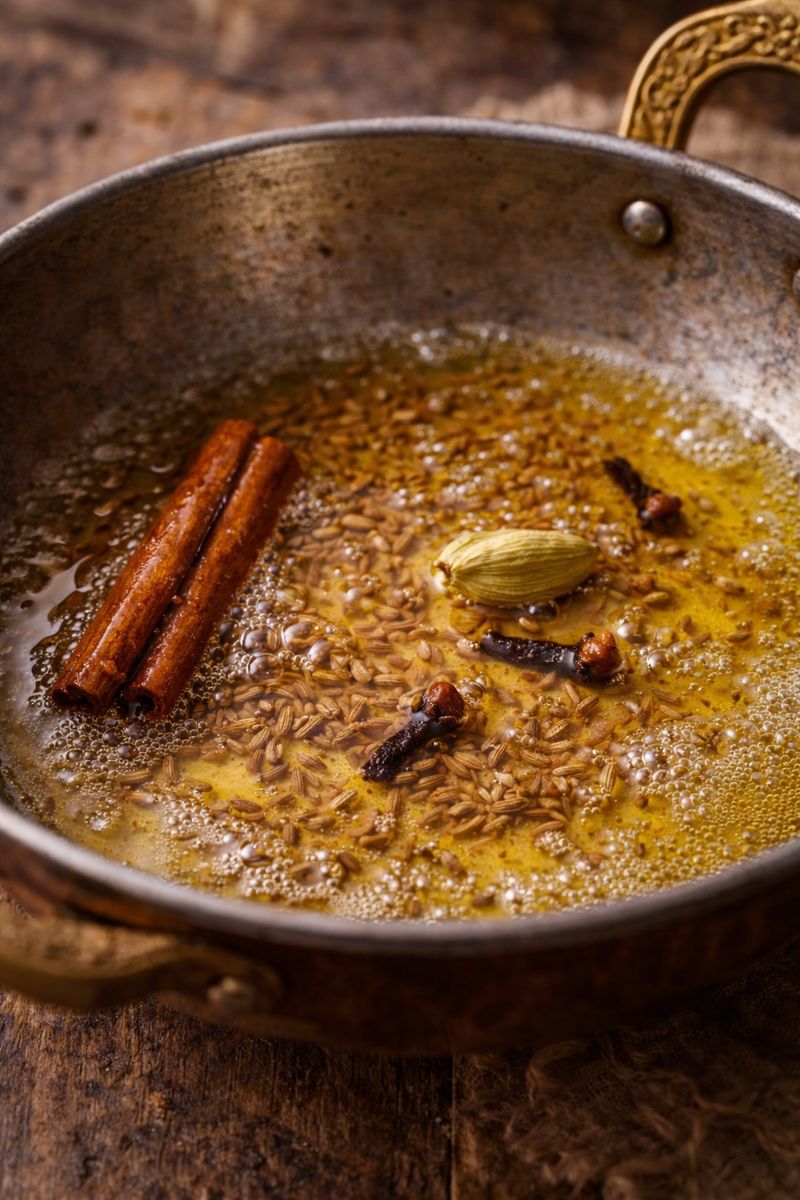 Heat ghee in a heavy-bottom pan or handi. Add cumin seeds, cloves, cardamom, and cinnamon, letting them release aroma.