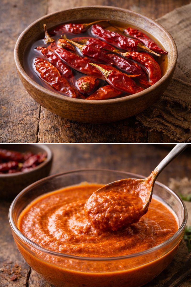 Soak dried red chillies in warm water for 30 minutes. Grind into a smooth paste and keep aside.