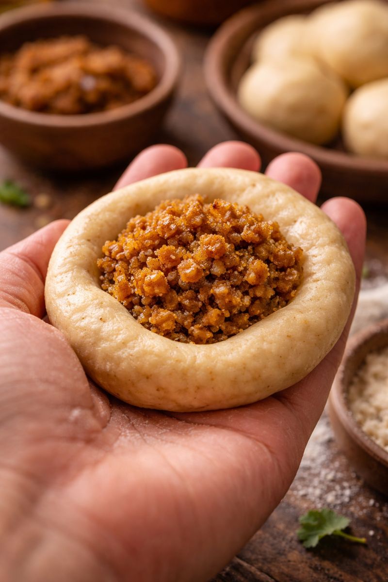 Flatten dough, place puran inside, seal carefully, and gently roll into a thin circle.