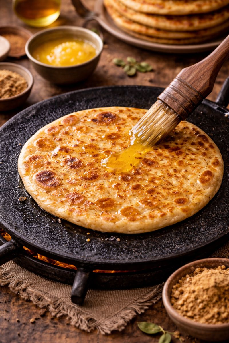 Cook on a hot tawa until golden spots appear on both sides. Apply ghee generously.