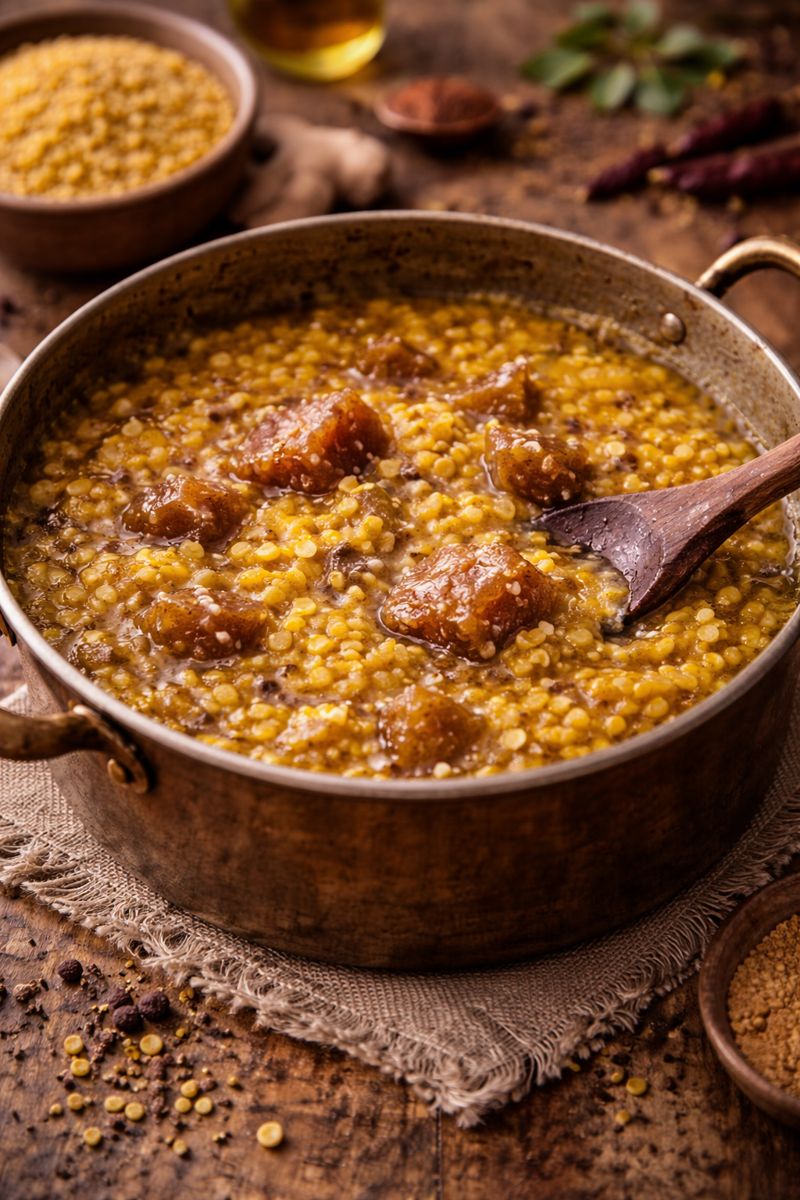 - A spicy curry made from leftover dal water.