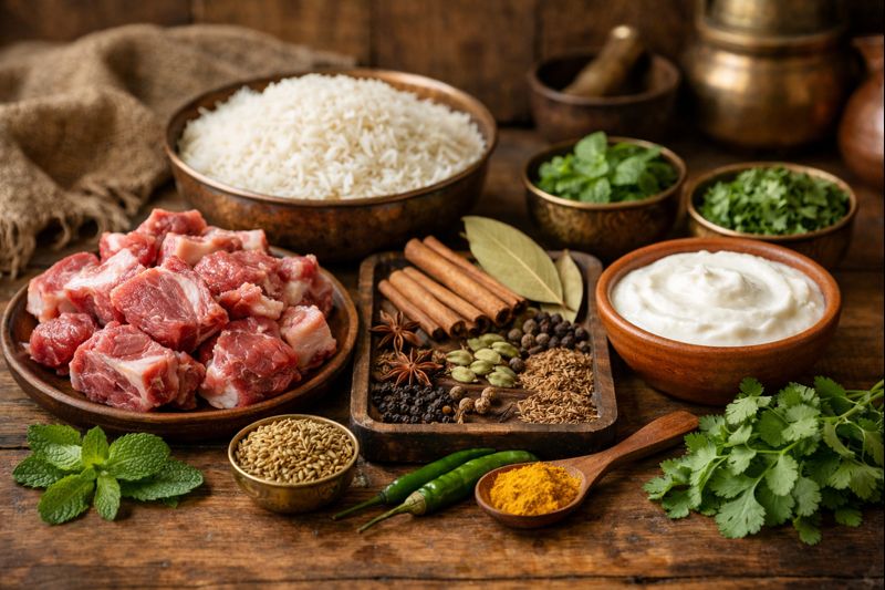 Raw mutton, basmati rice, whole spices, yogurt, mint, coriander arranged neatly on wooden surface